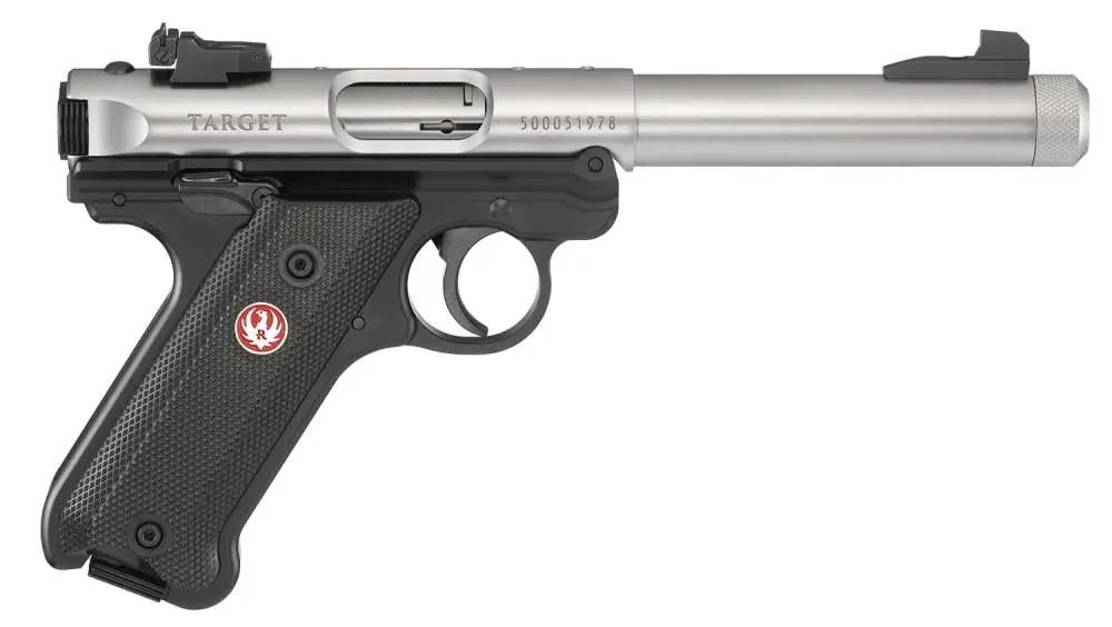 Ruger's Mark IV features a simple, one-button takedown for quick and easy field-stripping and proper chamber to muzzle cleaning. The recessed button in the back of the frame allows the upper receiver to tilt up and off of the grip frame without the use of tools. Its internal cylindrical bolt construction ensures permanent sight-to-barrel alignment, while the contoured ejection port and easy-to-grasp bolt ears allow for durable and reliable operation. The accurate sighting system features a drilled and tapped receiver for Weaver- or Picatinny-style rail. The Mark IV is a single action and utilizes an ambidextrous manual safety, push-button magazine release on the left side, and an ergonomic bolt stop. It includes two 10-round magazines. This exclusive pistol has a threaded stainless steel barrel, and features a black anodized aluminum frame, making it a distributor exclusive.