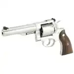 Ruger's Redhawk revolver features a triple-locking cylinder that is locked into the frame at the front, rear and bottom for more positive alignment and dependable operation. The single-spring mechanism allows for a smooth, light trigger pull, while the patented transfer bar mechanism provides an unparalleled measure of security. Its rugged stainless steel construction with no side plates, is designed specifically to handle powerful magnum loads through extra metal in top strap, sidewalls and barrel mounting areas. The Redhawk also has dual chambering and colored insert front blade sight and adjustable rear with white outline. This model has a stainless steel frame, 5.5" barrel, and cylinder. It also has hardwood grip and includes three moon clips.