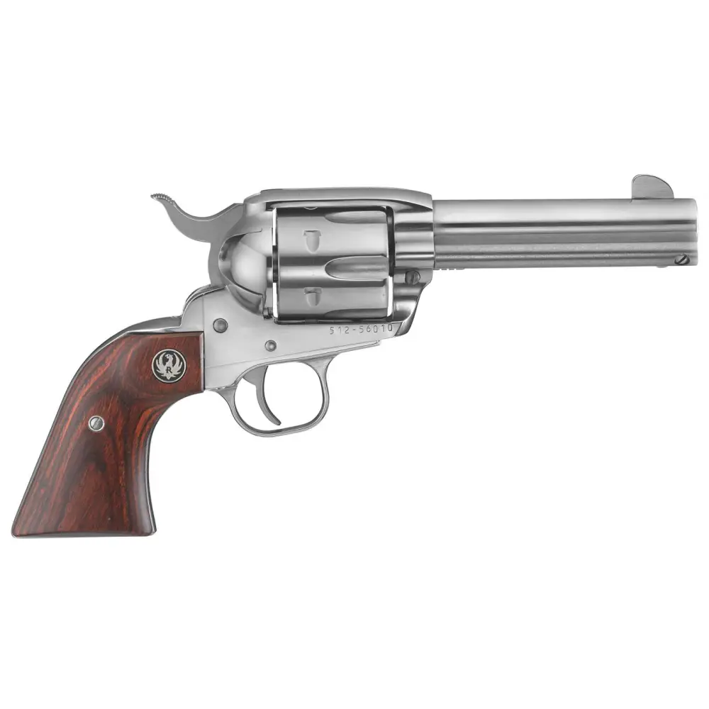 Ruger's Vaquero features a handsome, larger crescent-shaped ejector rod head that boasts traditional form, which makes it perfect for every cowboy or cowgirl. Its patented reverse indexing pawl allows for easier loading and unloading, while the traditional beveled cylinder simplifies holstering. The transfer bar mechanism and loading gate interlock provide an unparalleled measure of security against accidental discharge. The Vaquero also has a traditional western-style, hand-filling grip and a cold hammer-forged barrel.