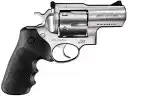 Ruger's Super Redhawk revolver features a strong extended frame with extra metal in top strap, sidewalls and barrel mounting areas to handle powerful, big game loads. Its triple-locking cylinder is locked into the frame at the front, rear and bottom for more positive alignment and dependable operation. The patented transfer bar mechanism provides an unparalleled measure of security, while the peg-style grip frame easily accommodates custom grips. The recoil cushioning Hogue Tamer Monogrip with an internal recoil cushion helps reduce the impact of powerful loads. The Super Readhawk also has dual chambering, corrosion-resistant stainless steel finish, cold hammer-forged barrel, and an adjustable rear sight and fixed, replaceable insert ramp front. This Alaskan model is chambered in 44 Remington Magnum and has a 2.5" barrel and black grip.