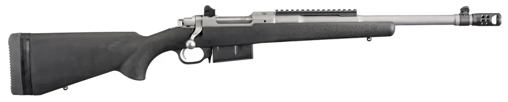 Ruger's Gunsite Scout Rifle is developed with Gunsite, which makes it "Gunsite Approved" and features the Gunsite name rollmarked on the receiver. It has a forward-mounted Picatinny rail which allows for the mounting of modern optics and a built-in, accurate sighting system with ghost ring adjustable rear aperture sight and a non-glare, blade front sight. Patented integral scope mounts, are machined directly on the solid-steel receiver which provides a stable mounting surface. The non-rotating, Mauser-type controlled round feed extractor features a fixed blade-type ejector that positively ejects the empty cases as the bolt is moved fully rearward. The Gunsite Scout Rifle also has a free-floated, cold hammer-forged barrel with ultra-precise rifling, three-position safety, sling swivel studs, detachable box magazine with push-forward magazine release, and a soft rubber buttpad with buttpad spacers. This model has a 16.1" stainless steel barrel and a black synthetic stock.