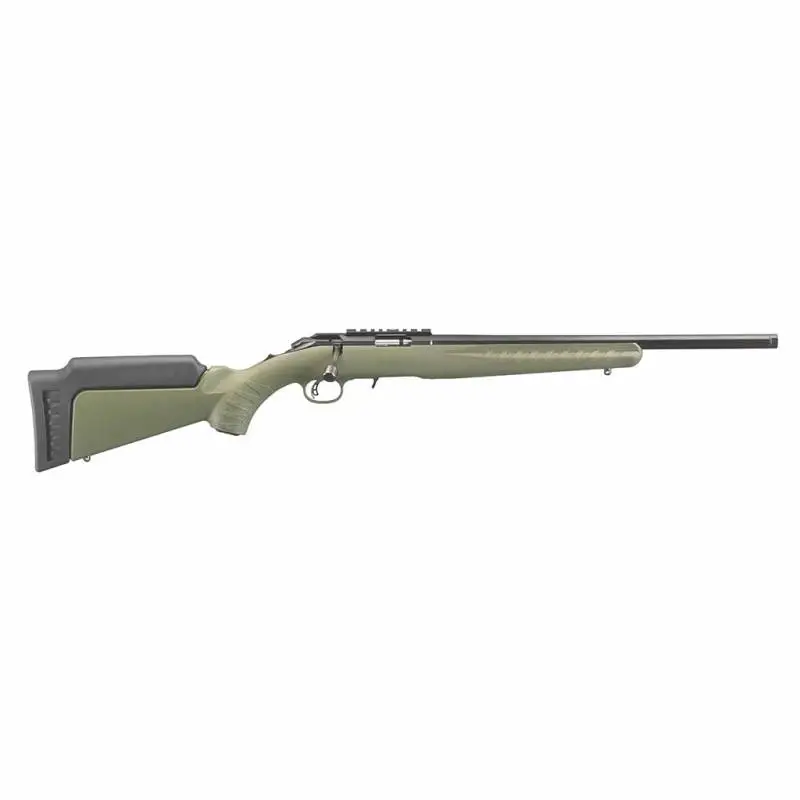 Ruger's American Rimfire rifle features a patent-pending Power Bedding integral bedding block system which positively locates the receiver and free-floats the barrel for outstanding accuracy. The cold hammer-forged barrel results in ultra-precise rifling which provides exceptional accuracy, longevity and easy cleaning. The American Rimfire rifle also has a Ruger Marksman Adjustable trigger, tang safety, easy-to-use 10/22-style extended magazine release, and a 3/8" rimfire scope base that is machined into the receiver, which is also drilled and tapped. Included is Williams' fiber optic front sight and adjustable, "V" slot, folding-leaf rear and sling swivel studs. This Standard model has an 18" blued barrel, OD green synthetic stock with two long length of pull modules, and a detachable, flush-mounted JMX-1 9-round rotary magazine.