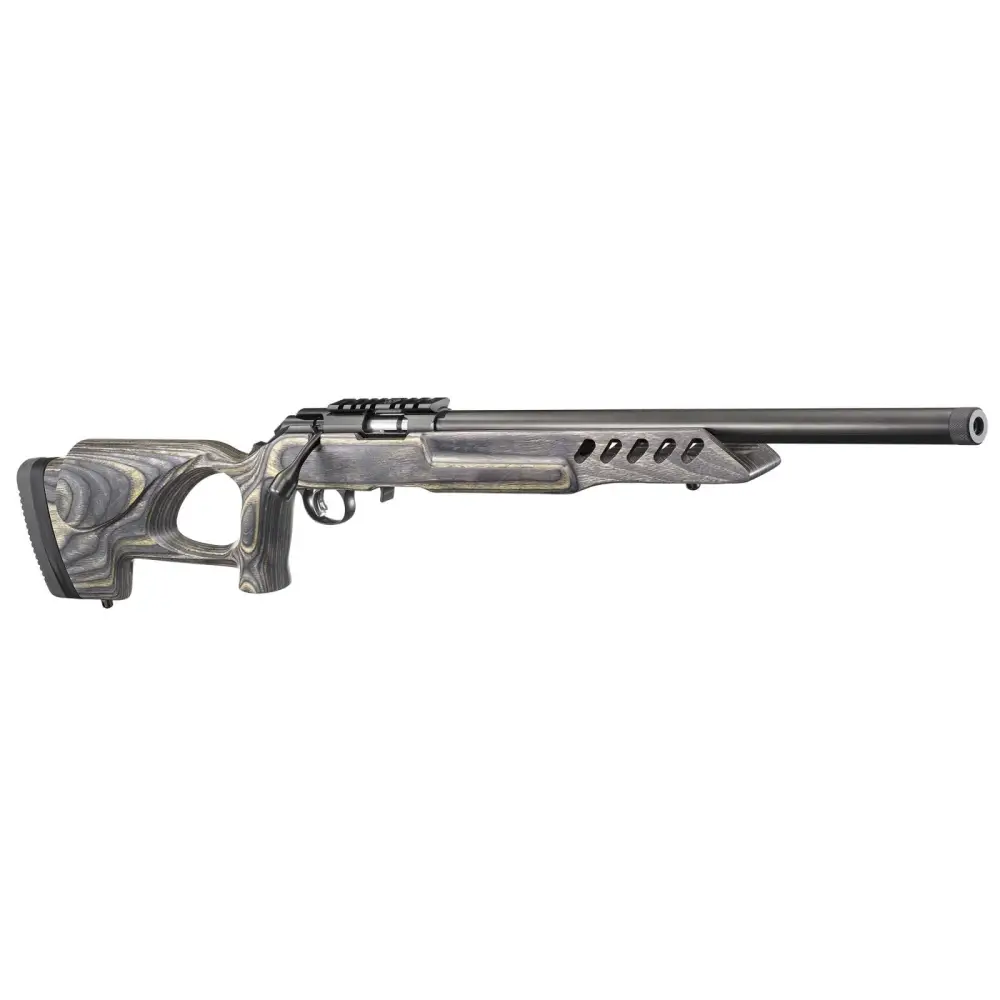Ruger's American Rimfire rifle features a patent-pending Power Bedding integral bedding block system which positively locates the receiver and free-floats the barrel for outstanding accuracy. The cold hammer-forged barrel results in ultra-precise rifling which provides exceptional accuracy, longevity and easy cleaning. The American Rimfire rifle also has a Ruger Marksman Adjustable trigger, tang safety, easy-to-use 10/22-style extended magazine release, and a 3/8" rimfire scope base that is machined into the receiver, which is also drilled and tapped. This model has an 18" threaded barrel, black laminate stock with thumbhole and adjustable LOP, and a detachable, flush-mounted 10/22 BX-1 rotary magazine.