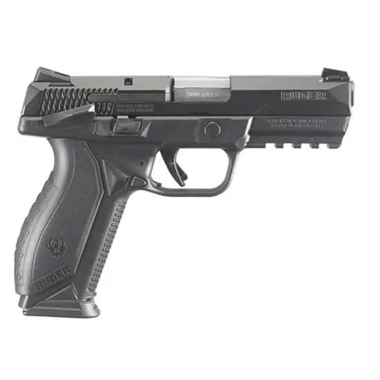 The Ruger American Pistol has a recoil-reducing barrel cam, low-mass slide, low center of gravity and low bore axis. The pre-tensioned striker system features a powerful striker spring for positive ignition without a heavier trigger pull. Its non-slip surfaces include functional slide serrations and grip/frame texturing for enhanced control. The American Pistol features a modular wraparound grip for adjusting palm swell and trigger reach to fit a wide range of hand sizes. Ergonomic grip modules lock in solidly and do not loosen. It has an ambidextrous slide stop and magazine release, Novak LoMount carry three-dot sights, MIL-STD-1913 Picatinny rail.Safety features include internal, automatic sear block system, ambidextrous manual safety and integrated trigger safety. Includes two nickel-Teflon plated steel magazines; small, medium and large grip modules.