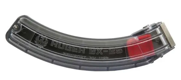The BX-25 genuine Ruger factory magazine has been tested and proven to feed as reliably as the standard BX-1 10-round Ruger rotary magazine. The BX-25 features a stainless steel constant-force spring that provides feed consistency round after round. It is compatible with any factory original Ruger 10/22 rifle, SR-22 rifle, and 22 Charger. This model has a clear finish.