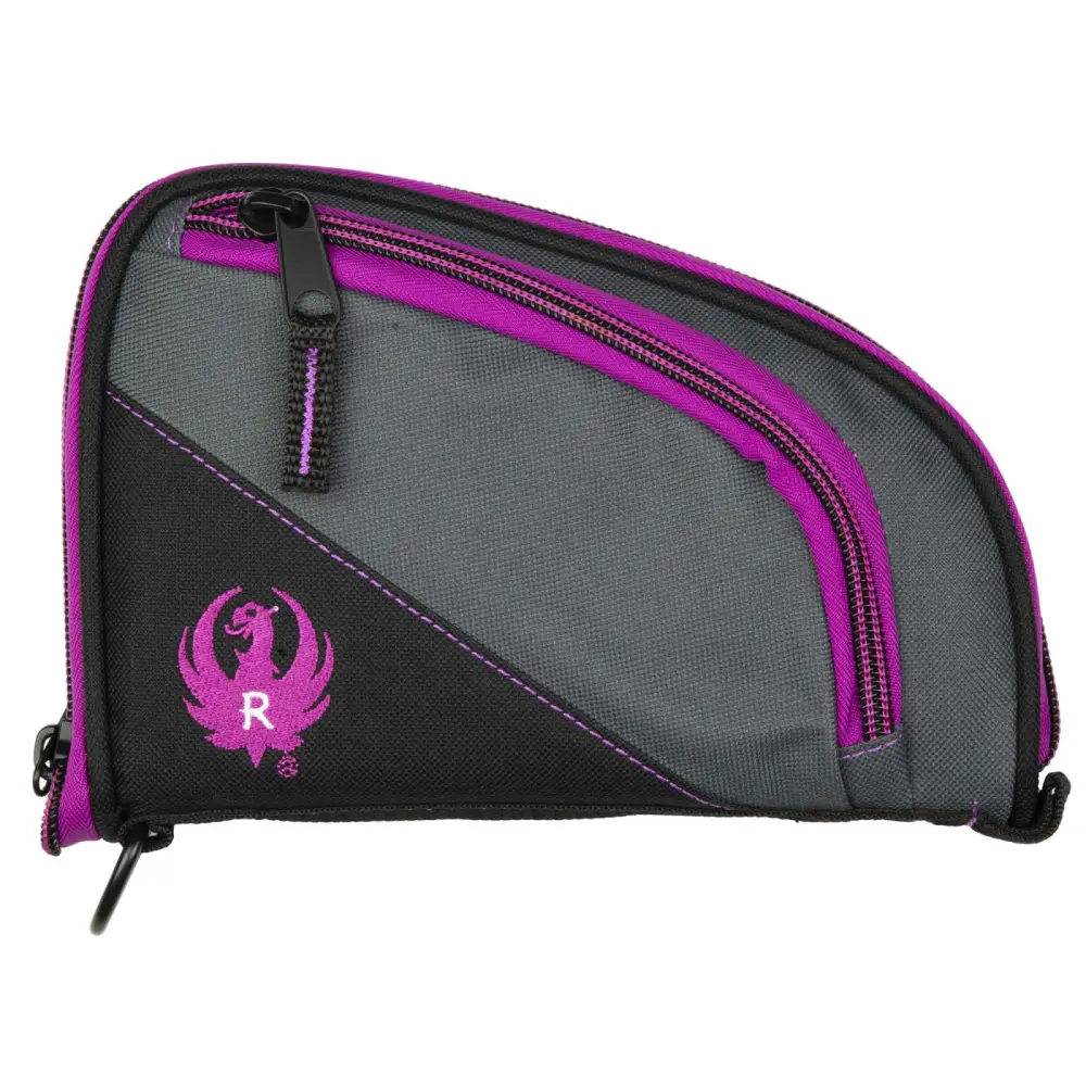 The Ruger Tucson Women's Handgun Case is black and gray with orchid accents and has a soft knit lining to protect your firearm. Comes with a barrel protecting pocket, and an exterior storage pocket, plus the case is lockable inside.