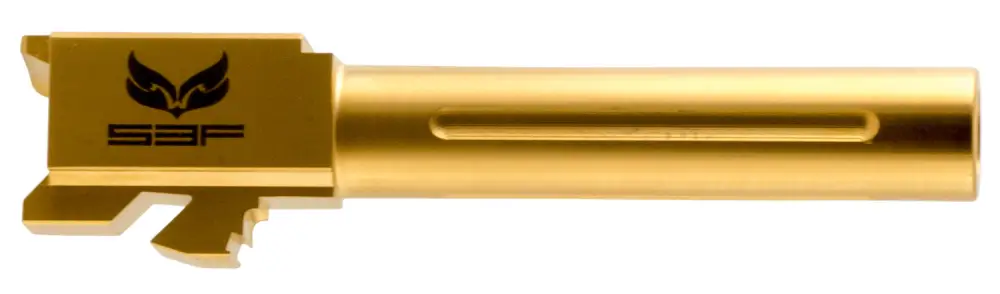 This model is compatible with Glock 19 Gen 1-5, including X. It is fluted with a Gold Titanium Nitride finish.