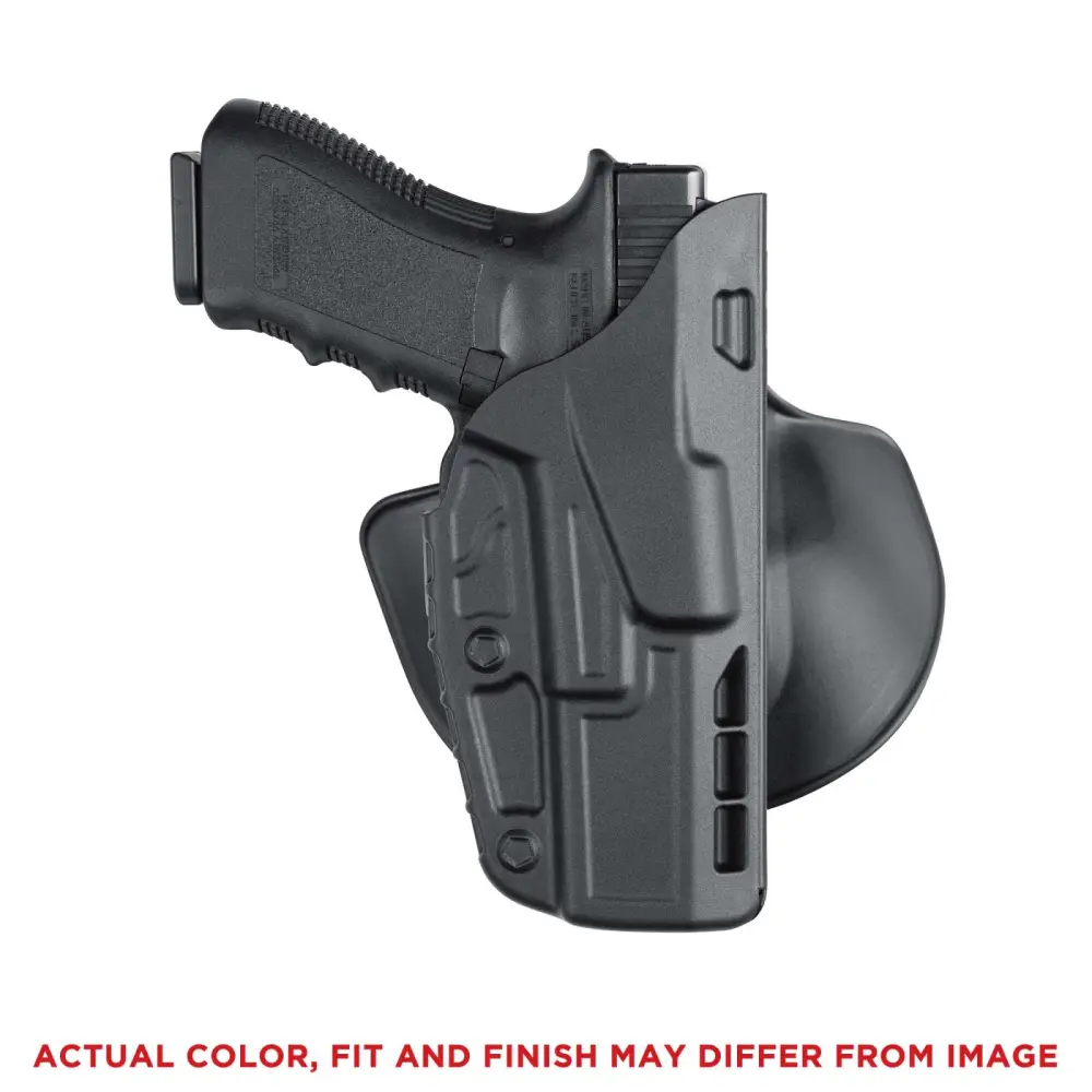 The Safariland Model 7378 7TS ALS Concealment Holster is constructed of SafariSeven, a proprietary nylon blend that is completely non-abrasive to a firearm's finish. and is a paddle and belt loop combo holster. Features an open-top design without SLS for quick retrieval of weapon, ALS (Automatic Locking System) secures weapon once holstered; simple straight up draw once release is deactivated and raised stand off surfaces in holster's interior creates air space around the weapon allowing dirt and moisture to quickly clear any contact with the firearm. The 7378 7TS has a very high heat and low cold tolerance; structurally sound from 300 degrees fahrenheit to -50 degrees fahrenheit. Includes injection-molded belt loop; is user adjustable for cant and can be worn crossdraw.