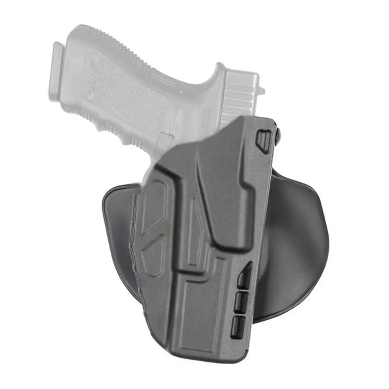 The Safariland Model 7378 7TS ALS Concealment Holster is constructed of SafariSeven, a proprietary nylon blend that is completely non-abrasive to a firearm's finish. and is a paddle and belt loop combo holster. Features an open-top design without SLS for quick retrieval of weapon, ALS (Automatic Locking System) secures weapon once holstered; simple straight up draw once release is deactivated and raised stand off surfaces in holster's interior creates air space around the weapon allowing dirt and moisture to quickly clear any contact with the firearm. The 7378 7TS has a very high heat and low cold tolerance; structurally sound from 300 degrees fahrenheit to -50 degrees fahrenheit. Includes injection-molded belt loop; is user adjustable for cant and can be worn crossdraw.