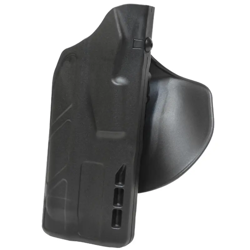 The Safariland Model 7378 7TS ALS Concealment Holster is constructed of SafariSeven, a proprietary nylon blend that is completely non-abrasive to a firearm's finish and is a paddle and belt loop combo holster. Features an open-top design without SLS for quick retrieval of weapon, ALS (Automatic Locking System) secures weapon once holstered; simple straight up draw once release is deactivated and raised stand off surfaces in holster's interior creates air space around the weapon allowing dirt and moisture to quickly clear any contact with the firearm. The 7378 7TS has a very high heat and low cold tolerance; structurally sound from 300 degrees fahrenheit to -50 degrees fahrenheit. Includes injection-molded belt loop; is user adjustable for cant and can be worn crossdraw.