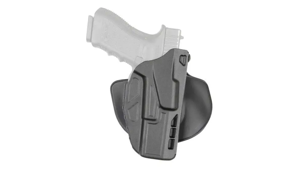 The Safariland Model 7378 7TS ALS Concealment Holster is constructed of SafariSeven, a proprietary nylon blend that is completely non-abrasive to a firearm's finish. and is a paddle and belt loop combo holster. Features an open-top design without SLS for quick retrieval of weapon, ALS (Automatic Locking System) secures weapon once holstered; simple straight up draw once release is deactivated and raised stand off surfaces in holster's interior creates air space around the weapon allowing dirt and moisture to quickly clear any contact with the firearm. The 7378 7TS has a very high heat and low cold tolerance; structurally sound from 300 degrees fahrenheit to -50 degrees fahrenheit. Includes injection-molded belt loop; is user adjustable for cant and can be worn crossdraw.