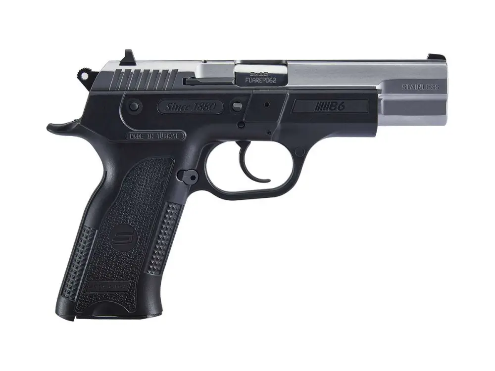 This SAR USA B6 pistol features 4.5" hammer-forged barrel, 3-dot sights, black polymer frame, stainless steel slide, and has a 17-round magazine capacity.