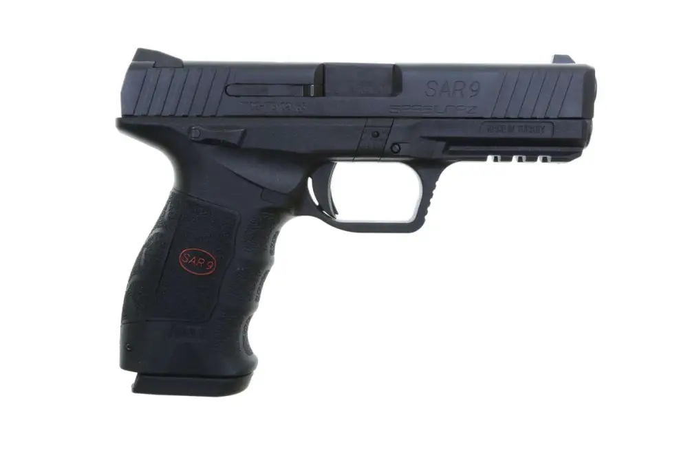 This SAR9 pistol features 4.5" hammer-forged barrel, 3-dot sights, interchangeable backstraps and panels, black oxide slide, and has a 17-round magazine capacity.