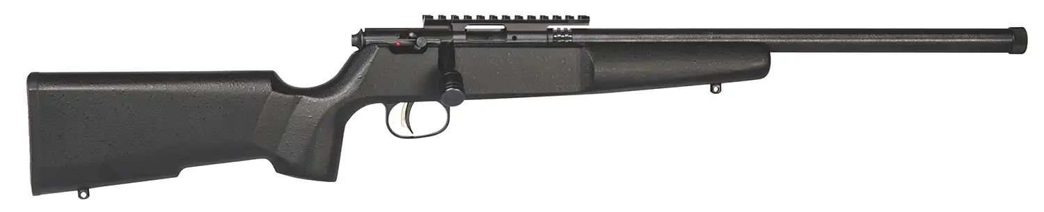 The industry's safest micro rimfire has come of age. The Rascal Target is built for accuracy and adaptability, thanks to a precision hardwood stock, heavy 16.125" barrel, one-piece Picatinny rail and threaded (1/2-28) muzzle. Like the original Rascal, the single-shot rifle cocks by lifting the bolt and unloads easily, without pulling the trigger. The design also builds superior shooting skills thanks to full-size rifle features, including Savages user-adjustable AccuTrigger system. The platform offers far better safety, functionality and accuracy than competing designs.