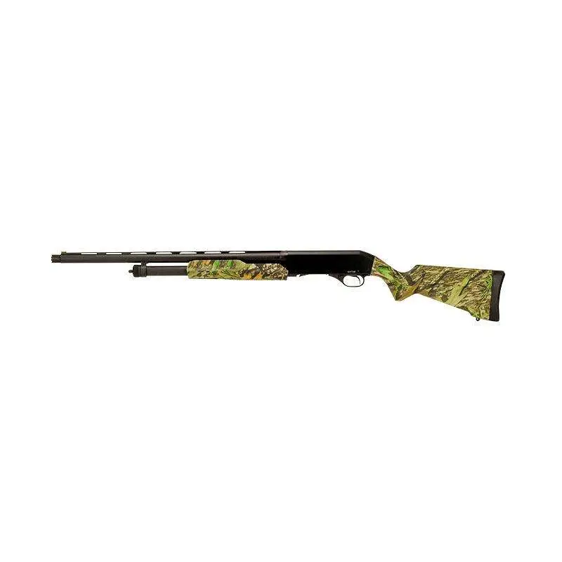Stevens 320 Field Grade pump action shotguns feature dual slide bars, a rotary bolt, rugged synthetic stock, and five-round mag capacity. This 12 gauge model was built specifically for turkey hunting with a Mossy Oak Obsession stock finish, one extended Full choke, fiber optic sight, and drilled and tapped receiver. It has a 3" chamber, 22" vent rib barrel, and a matte black metal finish.