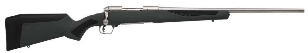 Savage's 110 Storm model delivers a customized fit required for consistent accuracy. It features Savage's AccuFit synthetic stock with five comb riser sizes for the perfect cheek-to-stock weld, four composite inserts to establish your unique length-of-pull, and AccuStock. The AccuStock consists of a rigid rail system firmly embedded in the stock throughout the forend of the rifle. It also engages the action three dimensionally along its entire length. The 110 Storm also features AccuTrigger for flexibility, a stainless steel barrel with button-rifling, soft grip fore-end and pistol grip, a drilled and tapped receiver, and a detachable box magazine. This 280 Ackley Improved model has a 22" stainless steel barrel and a gray finish stock.