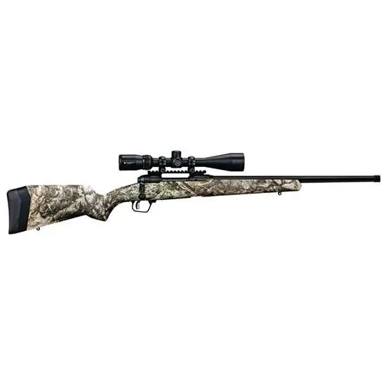 Savage's 110 Predator model delivers a customized fit required for consistent accuracy. It features Savage's AccuFit synthetic stock with five comb riser sizes for the perfect cheek-to-stock weld, four composite inserts to establish your unique length-of-pull, and AccuStock. The AccuStock consists of a rigid rail system firmly embedded in the stock throughout the foreend of the rifle. It also engages the action three dimensionally along its entire length. The 110 Predator also features AccuTrigger for flexibility, a carbon steel barrel, soft grip fore-end and pistol grip, and a detachable box magazine. This 223 Remington Apex model has a 20" matte black barrel with a threaded end cap. It also has a Mossy Oak Mountain Country camo stock and a Vortex Crossfire 4-12x44mm scope.