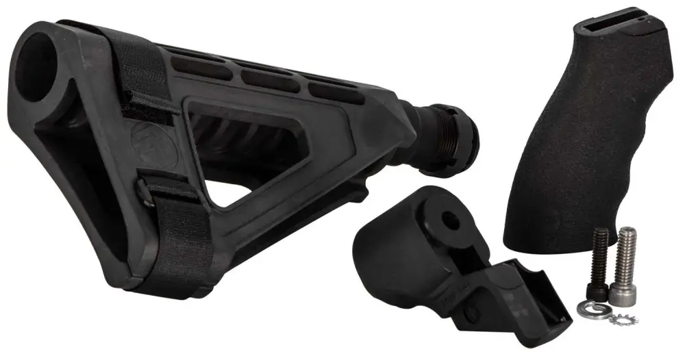 This SBM4 complete kit, is ready-to-assemble on your Mossberg 590 Shockwave, greatly enhancing the usability of the firearm by adding a third point of contact for stabilization. It includes: SBM4 pistol stabilizing brace; STDT-C pistol receiver extension; ERGO Flat Top SUREGRIP and Mossberg 590 adapter; castle nut; adjustable nylon strap.