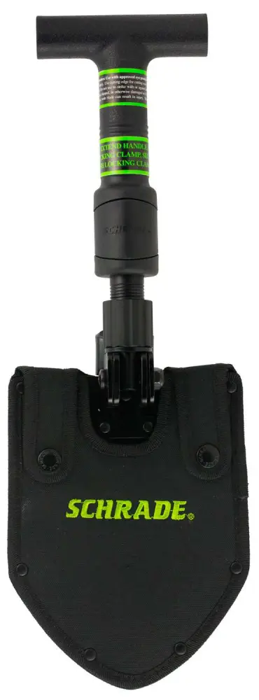 Schrade's Telescoping Folding Shovel is constructed of 1055 carbon steel with a polypropylene handle which features an aluminum inner tube. It comes with a black polyester belt sheath.