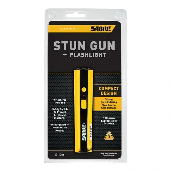 Sabre's Concealable Stun Gun with Flashlight is a pain-inducing stun gun with an impressive 0.845 uC charge for reliable protection when you need it most. It features an 100-lumen LED flashlight which helps you disorient from a distance. The safety switch prevents accidental discharge. Included is a rechargeable and wrist strap.