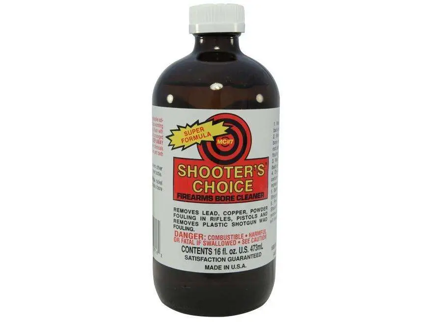 Shooters Choice Bore cleaner and conditioner removes copper, lead, powder and carbon fouling in one step. It is non-abrasive and dissolves plastic wad residue in shotguns. It conditions bore to resist fouling and removes rust, corrosion, contains no ammonia, and it also lubricates.