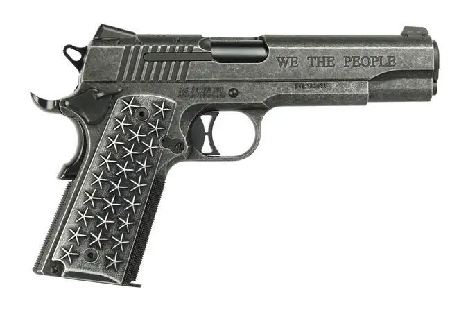 Inspired by a rich patriotic history, Sig's 1911 We The People pistol serves as a fitting tribute to both the Second Amendment and the most storied handgun in history. This uniquely-American SAO pistol features custom distressed aluminum grips adorned with 50 stars (25 per side) representing each state in the union. The distressed finish on the stainless steel slide and frame includes patriotic engravings, such as 13 stars atop the slide with "WE THE PEOPLE" and "1776" on the slide flats. While it honors the past, We The People is fully equipped for modern day use with a skeletonized hammer, ambidextrous safety, and low-profile night sights.