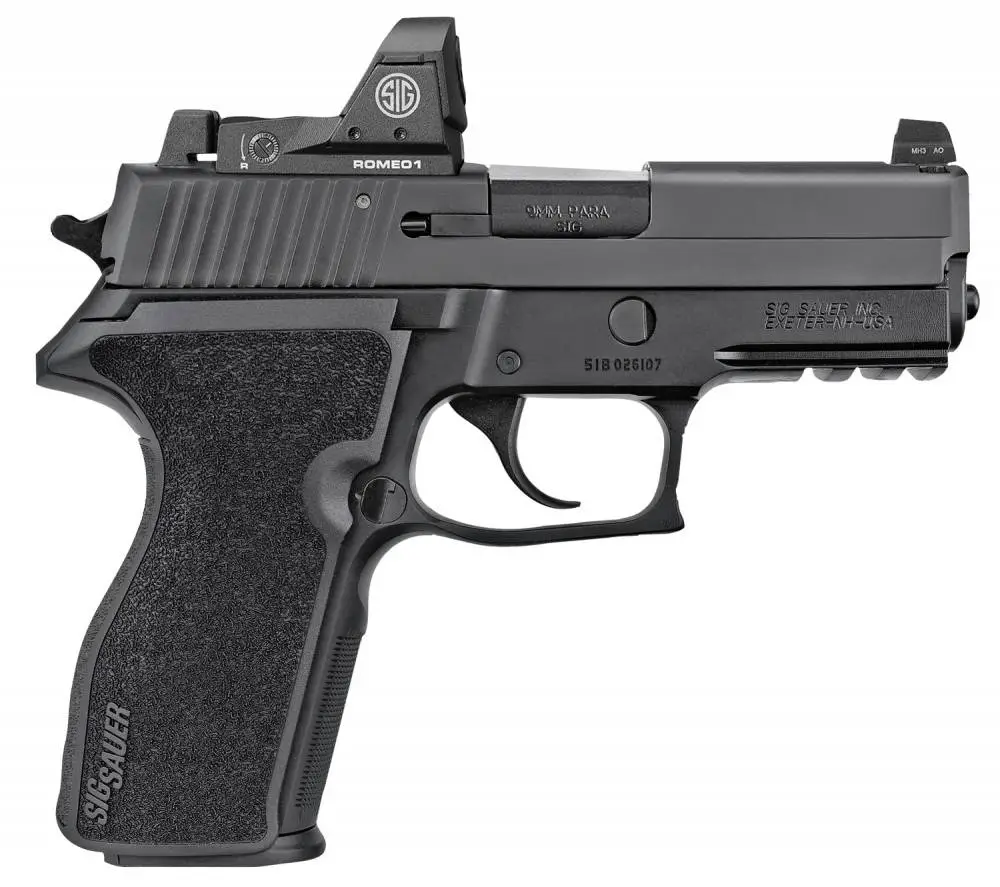 The P229 RX model is equipped with a slide-mounted Romeo1 reflex sight. It also has G10 grip, SigLite night sights, carbon steel barrel, and a M1913 Picatinny rail.