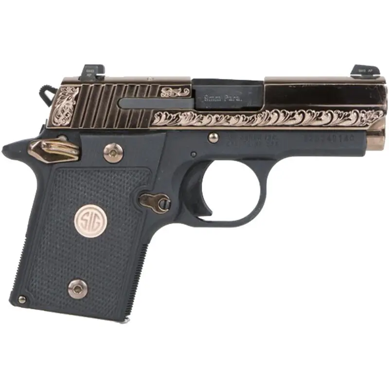 This model has an aluminum alloy frame with a black hard coat anodized finish, stainless steel slide with a polished PVD Rose Gold finish, Rose Gold controls, SigLite night sights, black G-10 grip with Rose Gold Sig medallion, and comes with one 6-round magazine.