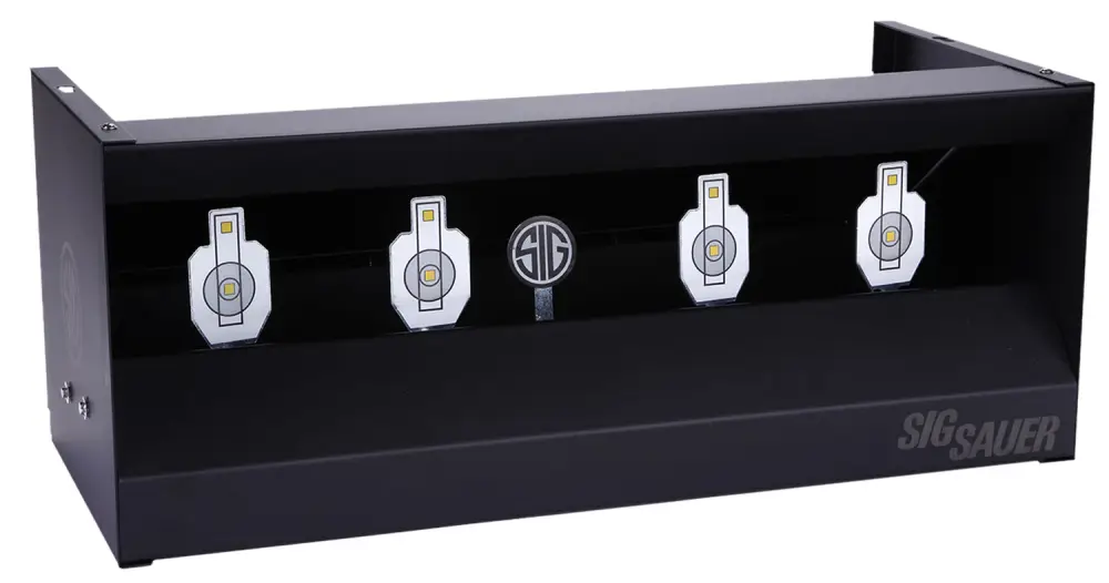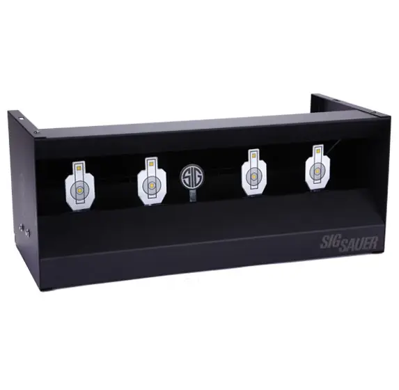 The dual shooting gallery by Sig Sauer is an all metal construction center mass target system. This target features a pellet trap to collect all of your pellets which makes packing up a breeze, along with 4 center mass targets and one self-reset target.