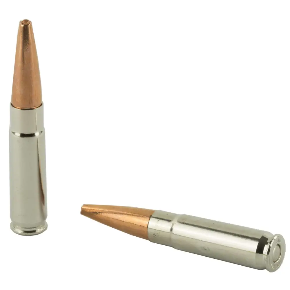 These superior hunting rounds yield consistent 1.8X diameter expansion using premium-quality primers for minimum velocity variation. Perfected for AR style rifle feeding, optimized nose geometry and premium nickel-plated shell casings deliver consistently reliable accuracy for taking down game.