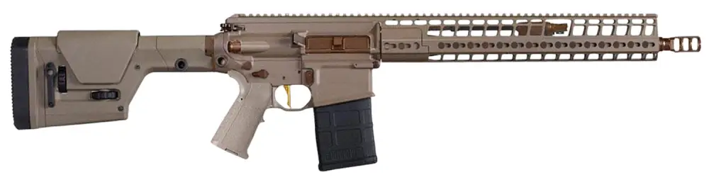 This 6.5 Creedmoor Marksman model has a FDE cerakote finish, Magpul PRS stock, and ambidextrous charging handle.