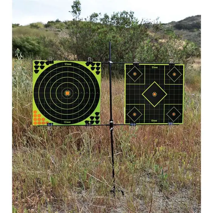 SME's paper target stand is constructed with a 5/16" steel frame and has a black powdercoat finish. The adjustable top horizontal bar accommodates various target sizes. It has a sturdy trident footer ground stake for stability. This target stand includes eight (8) clips to secure two paper targets.