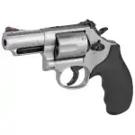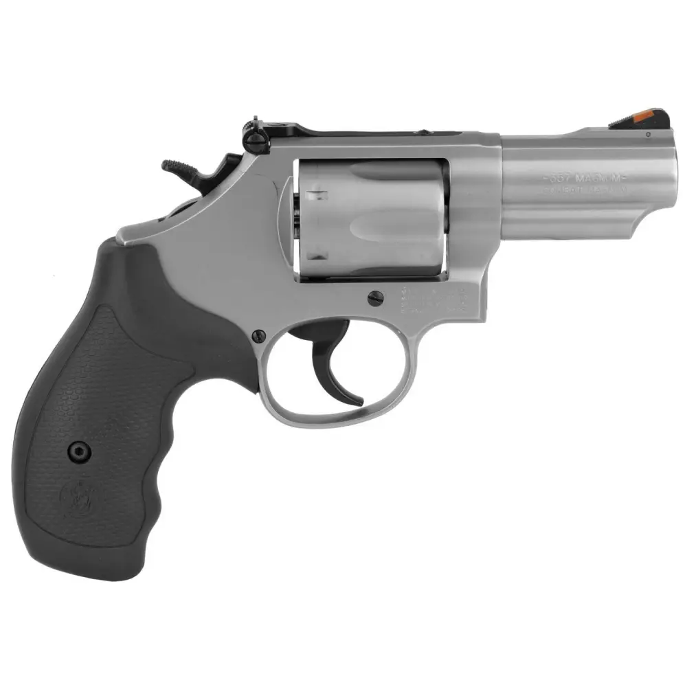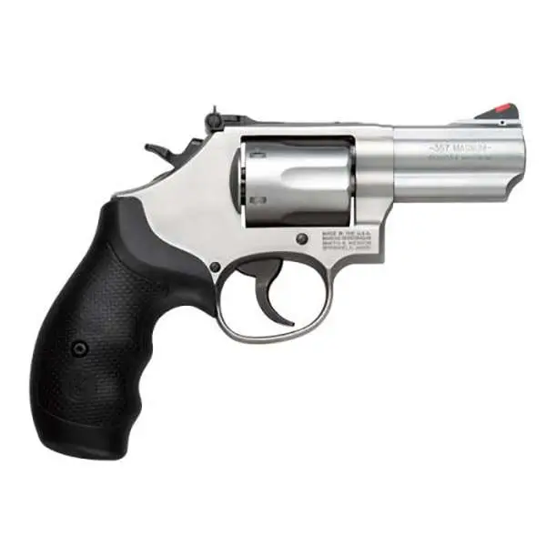 The K-Frame revolver has been a favorite for military and police professionals as well as target shooters and enthusiasts. It features a full top strap and barrel serration, Ball-Detent Lock-Up and 2 piece barrel. This model has a stainless steel barrel, frame, and cylinder, black synthetic grip, and red ramp front and adjustable rear sights.