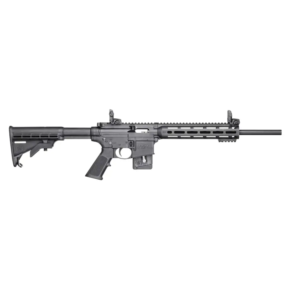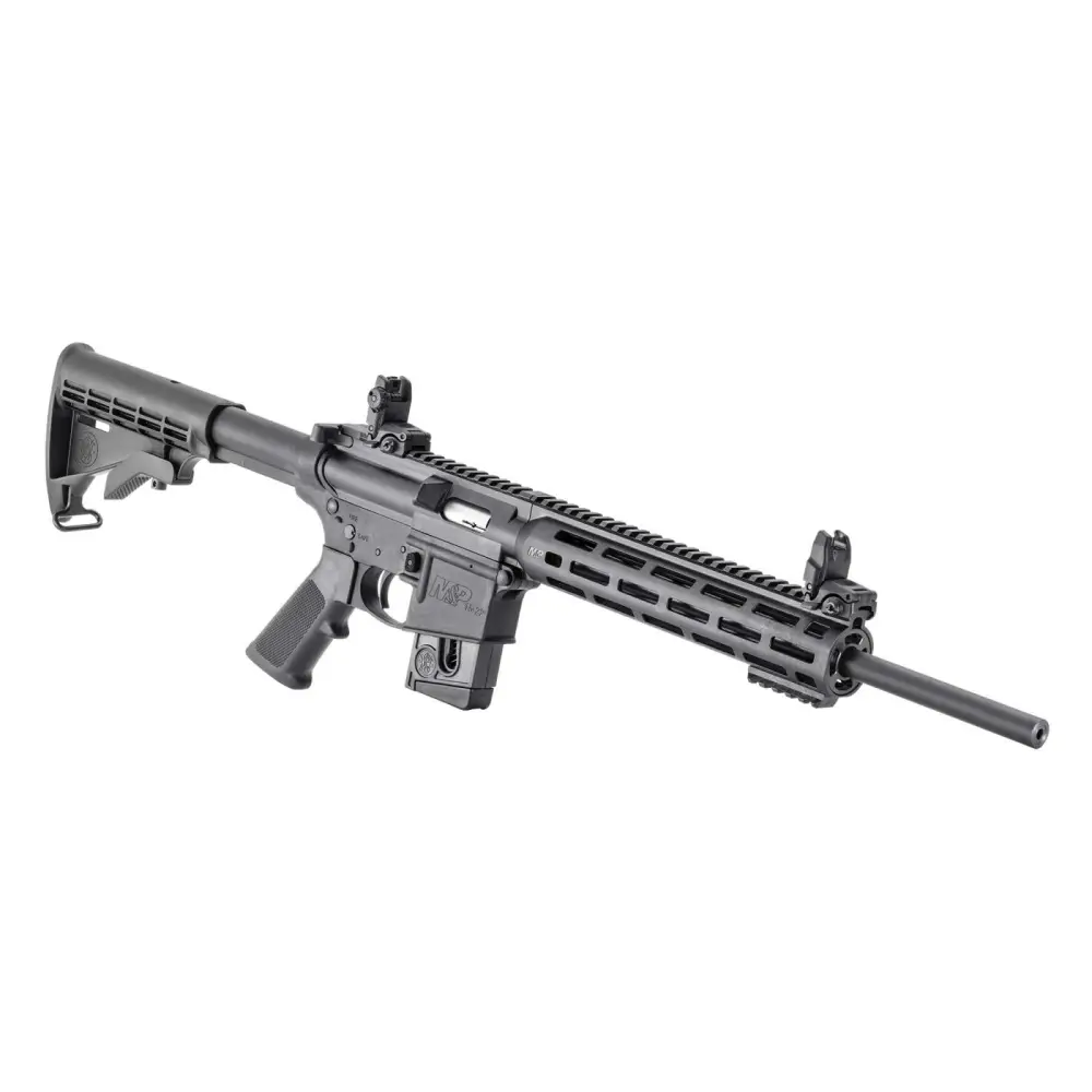 The M&P15-22 Sport features a 10" M&P slim Magpul M-LOK handguard which allows users to easily customize their weapon without removing the handguard. It includes a 2" M-LOK rail panel with each rifle, and removable Magpul MBUS front and rear folding sights. It has a fixed CAR stock, functioning charging handle, shell deflector, and two-position, receiver-mounted safety lever. This model M&P15-22 Sport has a matte black finish, 16.5" barrel, 10-round magazine, and is CT, MA, NJ Compliant.