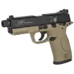 The Smith & Wesson M&P has a reinforced polymer chassis, superior ergonomics, ambidextrous controls, and proven safety features. In designing the M&P, Smith & Wesson considered the needs of military and law enforcement from every conceivable angle, so the M&P is the standard in reliability when your job is to serve and protect and your life is on the line. This M&P22 Compact model features a Cerakoted flat dark earth polymer frame with a Picatinny rail, black anodized aluminum slide, and 3-dot sights with an adjustable rear. Its threaded barrel comes with a thread adapter to fit most 1/2" x 28 threaded suppressors.