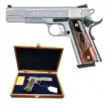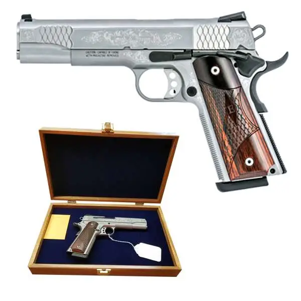 Smith & Wesson's 1911 SAO features beautiful machine scroll engraving on the stainless steel slide and frame with a matte glass bead metal finish. It has a 5" barrel, wooden laminate grips, and white dot sights. The Engraved 1911 includes wooden presentation case.