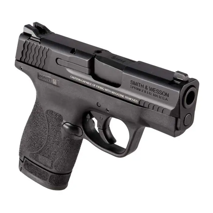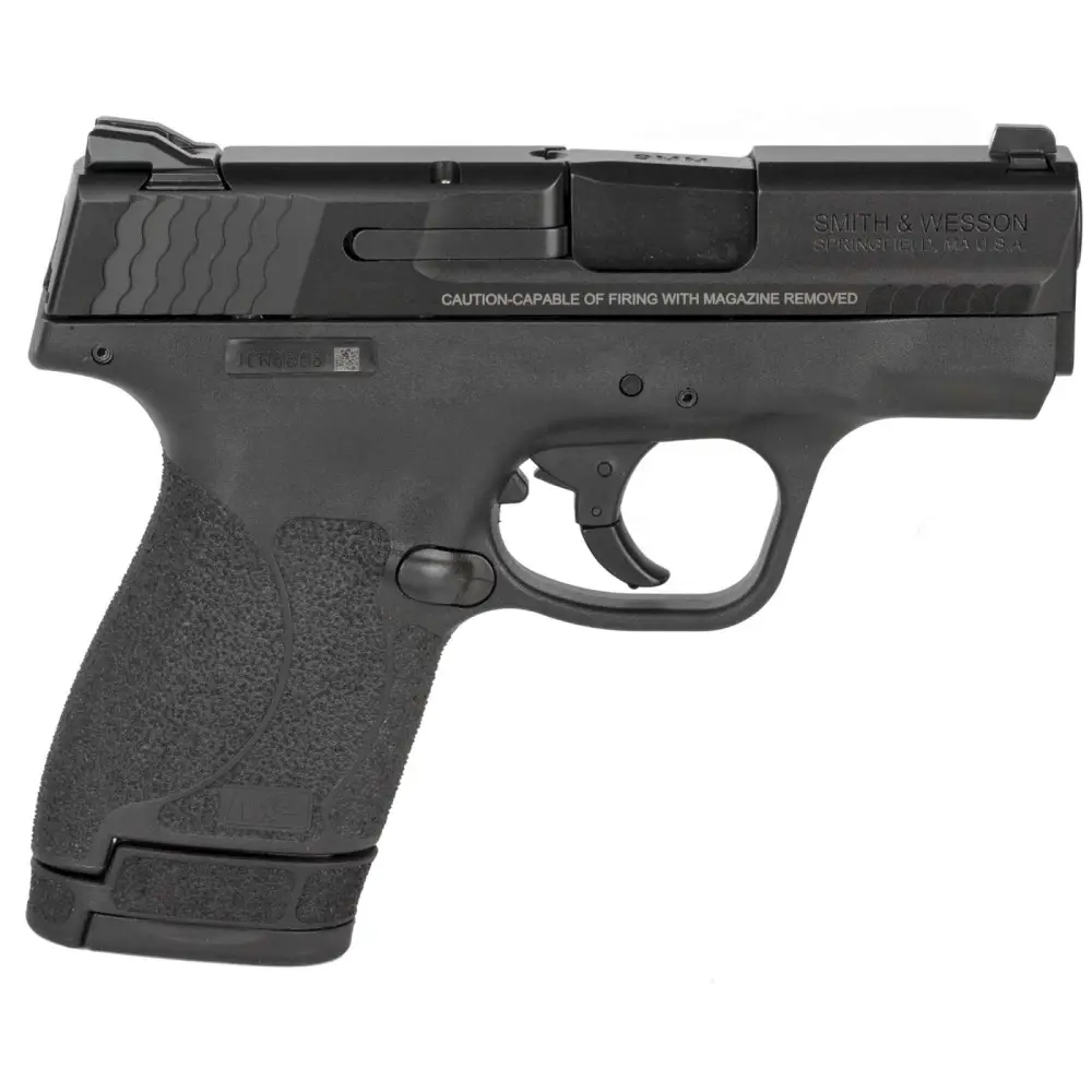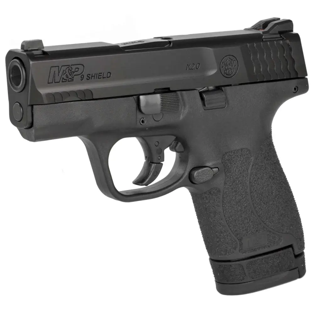 Smith & Wesson M&P pistols have a reinforced polymer chassis, superior ergonomics, and proven safety features. In designing the M&P, S&W considered the needs of military and law enforcement from every conceivable angle, so the M&P is the standard in reliability. M&P's patented take-down lever and sear deactivation systems allow for disassembly without pulling the trigger. The M&P Shield is easy to conceal, offering professional grade features with simple operation and reliable performance day or night. It puts the power and features of full sized M&P pistols into a slim, lightweight pistol the size of your hand. M&P M2.0 models feature aggressive grip texture for enhanced control, M&P M2.0 crisp trigger with lighter trigger pull, and a tactile and audible trigger reset. The stainless steel barrel and slide have an Armornite corrosion-resistant finish. This model has a black frame and slide finish, no manual safety, and 3-dot sights. It includes one 7-round magazine and one 8-round extended grip magazine.
