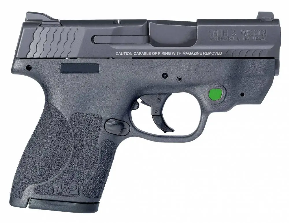 Smith & Wesson M&P pistols have a reinforced polymer chassis, superior ergonomics, and proven safety features. In designing the M&P, S&W considered the needs of military and law enforcement from every conceivable angle, so the M&P is the standard in reliability. M&P's patented take-down lever and sear deactivation systems allow for disassembly without pulling the trigger. The M&P Shield is easy to conceal, offering professional grade features with simple operation and reliable performance day or night. It puts the power and features of full sized M&P pistols into a slim, lightweight pistol the size of your hand. M&P M2.0 models feature aggressive grip texture for enhanced control, M&P M2.0 crisp trigger with lighter trigger pull, and a tactile and audible trigger reset. The stainless steel barrel and slide have an Armornite corrosion-resistant finish. This model has a black frame and slide finish, no thumb safety, and 3-dot sights. It includes a green Crimson Trace laser, one 7-round magazine and one 8-round extended grip magazine.