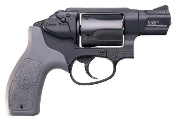 This Bodyguard model is a double action only with a 1.875" barrel, black ramp front sight with an integral rear sight, one-piece aluminum alloy upper frame, ambidextrous cylinder release and black PVD coating. It has a one-piece, gray polymer grip with a red Crimson Trace laser.