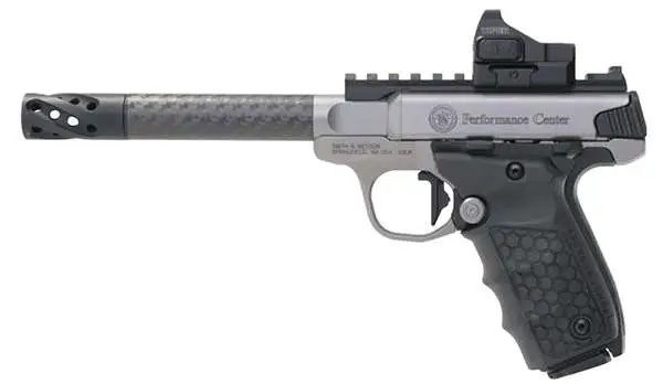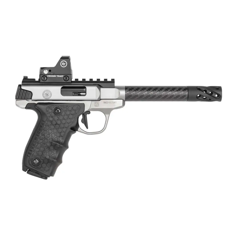 The Performance Center SW22 Victory Target pistols designed specifically for target shooting competitions. It features a stainless steel frame with target barrel with muzzle brake and flat face target trigger with an adjustable trigger stop. It utilizes adjustable fiber optic rear and fiber optic front sights, extended magazine release button, beveled magazine well and steel reinforced polymer thumb safety. The SW22 Victory Target also has Tandemkross "hiveGrips" with Target Thumbrest grip and includes a Picatinny-style rail and two (2) 10-round magazines. This model has a 6" carbon fiber barrel, stainless steel metal finish, and black grip. It also features a Vortex Viper red dot sight.