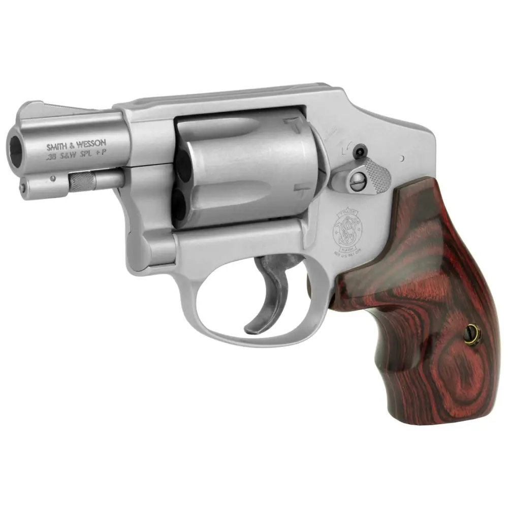 Smith & Wesson J-Frame revolver is designed to fire a full power round and is as simple and easy to use as it is reliable. The Model 642 LS is a variation on the Model 42 Centennial Airweight which integrates the time-tested features of the original with modern advancements. This Lady Smith model has an aluminum alloy frame, stainless steel barrel and cylinder, integral front and fixed rear sights, internal hammer, and a wood grip with finger grooves.