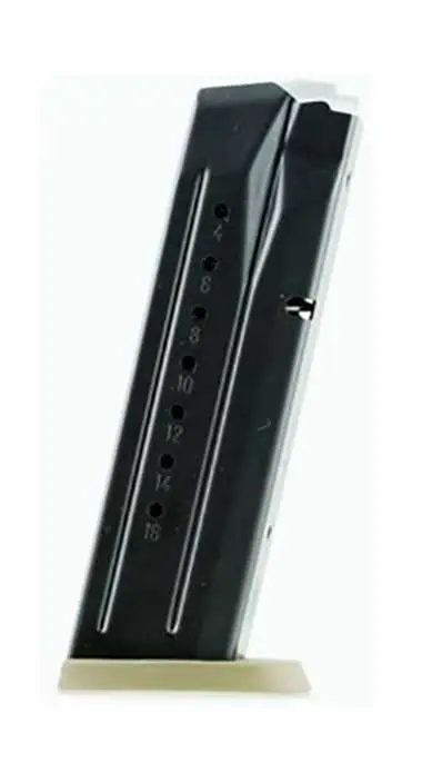 This magazine is compatible with Smith & Wesson M&P pistols chambered in 9mm. It has a black steel body. This model has a 17-round capacity and an FDE base plate.
