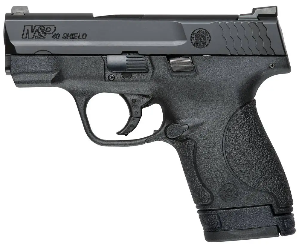 This M&P40 Shield model has a black frame and slide finish with Tritium front and rear night sights and no thumb safety. It includes one 6-round and two 7-round magazines.