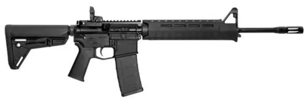 The M&P15 Magpul MOE SL model features a mid-length gas system, S&W/Magpul co-branded, forged lower with a flared magwell, integrated trigger guard, and a finger shelf. The M&P15 Magpul MOE also has a Magpul MOE SL grip, buttstock, handguard, PMAG magazine, and MBUS rear sight. Its barrel has an enhanced flash hider and an Armornite finish.