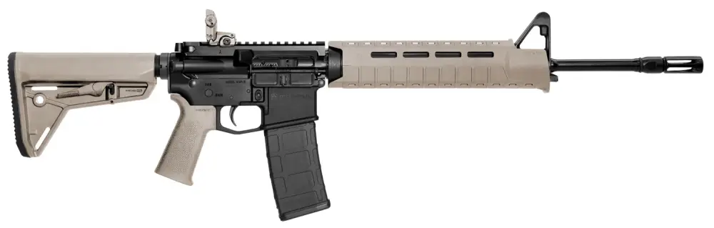 The M&P15 Magpul MOE SL model features a mid-length gas system, S&W/Magpul co-branded, forged lower with a flared magwell, integrated trigger guard, and a finger shelf. The M&P15 Magpul MOE also has a Magpul MOE SL grip, buttstock, handguard, PMAG magazine, and MBUS rear sight. Its barrel has an enhanced flash hider and an Armornite finish.
