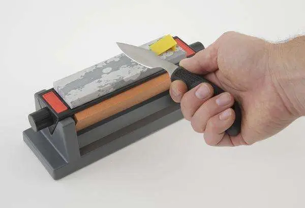 Smith's 6" Tri-Hone Sharpening System has easy stone rotation and identification. It also has coarse, medium, and fine sharpening stones, V-trough to catch excess solution, honing solution, and sharpening angle guide.
