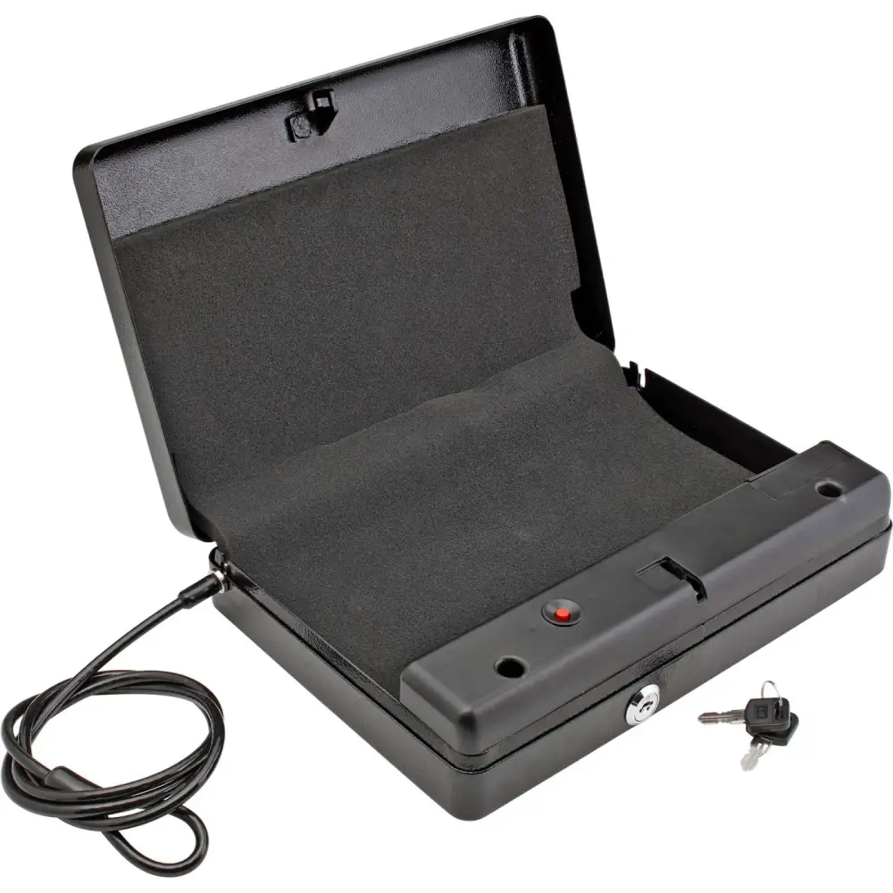The Keypad Safe protects your handguns, electronics, and other valuables. It is constructed of steel with foam-lined interior and is powered by a 9-volt battery (not included).