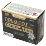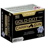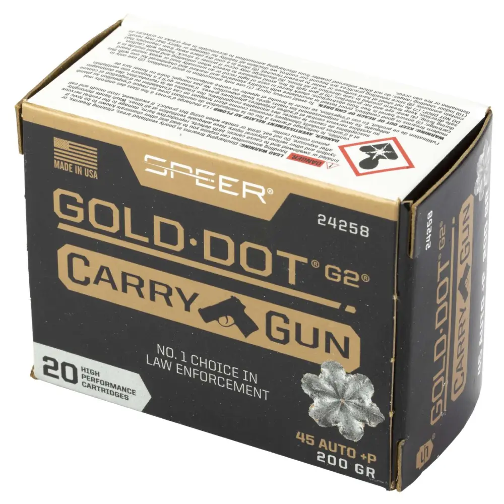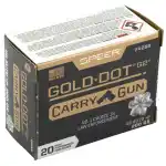 Insist on bigger protection from your compact pistol with Gold Dot Carry Gun. It brings the power of the proven Gold Dot G2 bullet design, loaded to achieve the best performance from compact pistols. The Gold Dot Carry Gun features the originals exclusive bullet nose design. Instead of a large hollow-point cavity, it has a shallow dish filled with a high-performance elastomer.