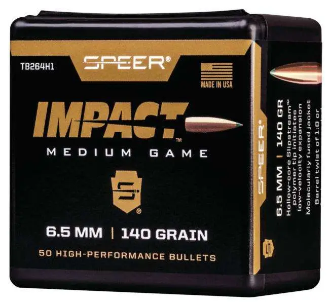 The Speer Impact blends tough, molecularly bonded construction with high ballistic coefficients and the Slipstream polymer tip. The combination results in deep penetration at close range as well as extreme accuracy and consistent low-velocity expansion at long distances.