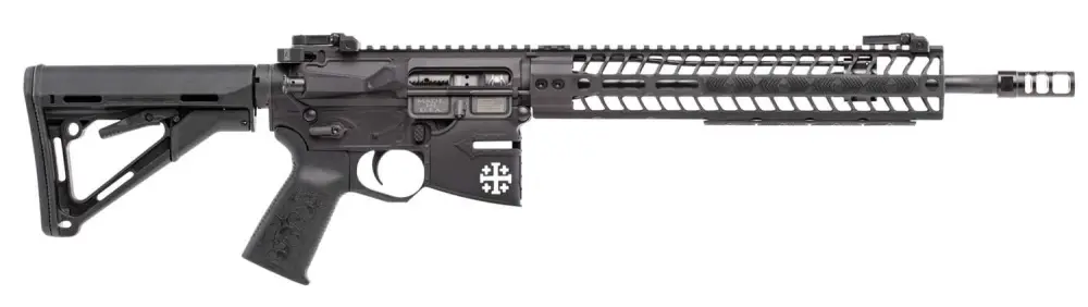 This Rare Breed Crusader features a 7075 T6 aluminum receiver with a black hardcoat anodized finish, 14.5" cold hammer forged barrel with a black phosphate finish, 12" M-LOK rail, and a Magpul CTR stock.